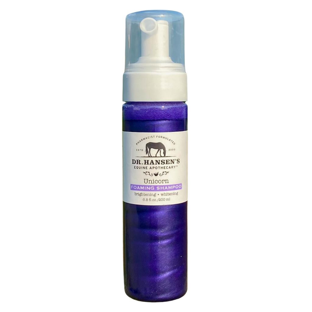 Dr. Hansen’s Equine Apothecary Unicorn Foaming Shampoo is sure to be your new favorite whitening shampoo.  Shake gently to see the unicorn sparkles inside!