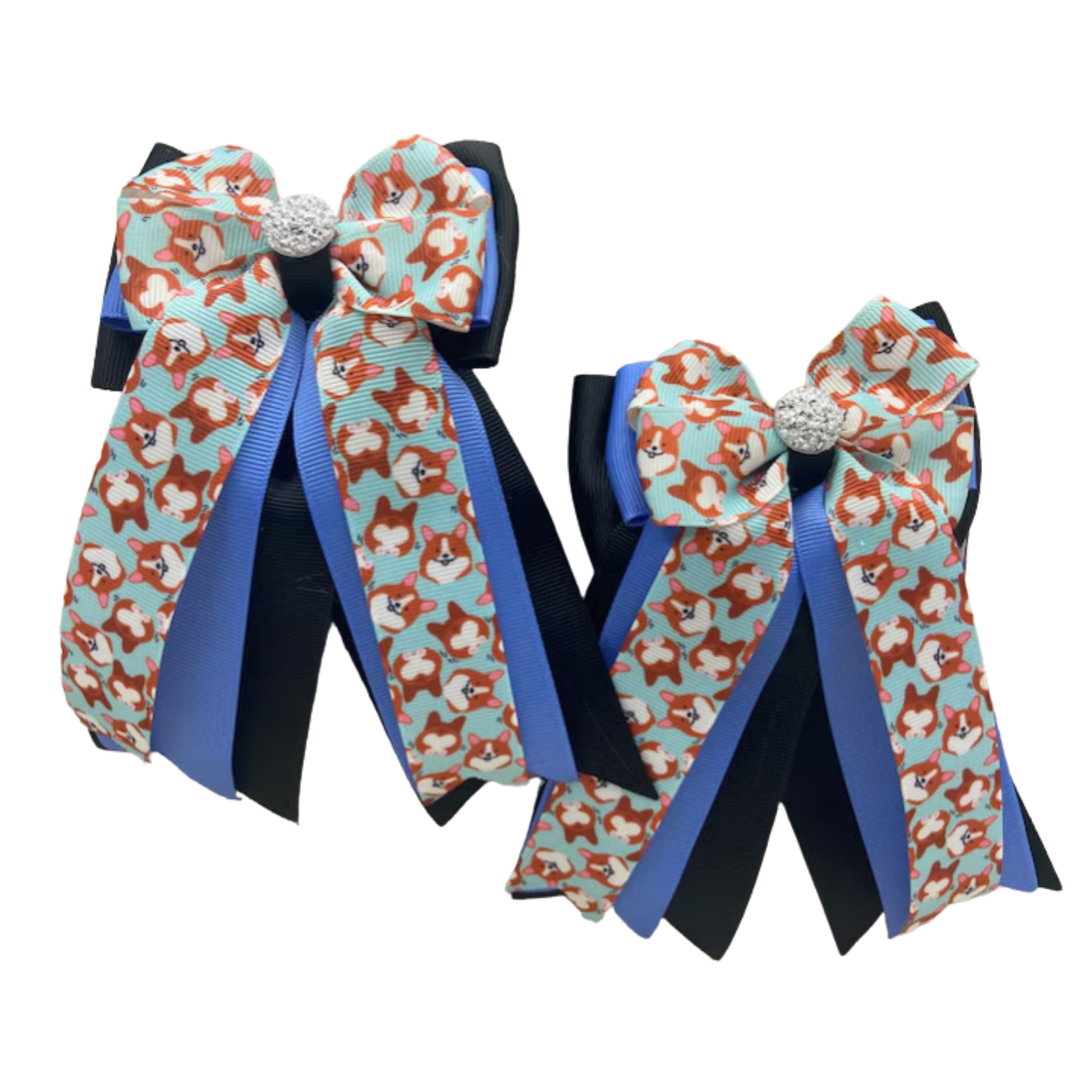 Horse show hair bows for short stirrup divisions, children's ponies divisions, and leadline. Beautiful, one-of-a-kind show bow, sold in a set. finished with a metal alligator clip in the back. Bows are sold in matching pairs. There are two bows to a set. you will need one set of bows for two braids. These bows are handmade. Though I do my best to make each bow in the set the same, there will be differences within the set.