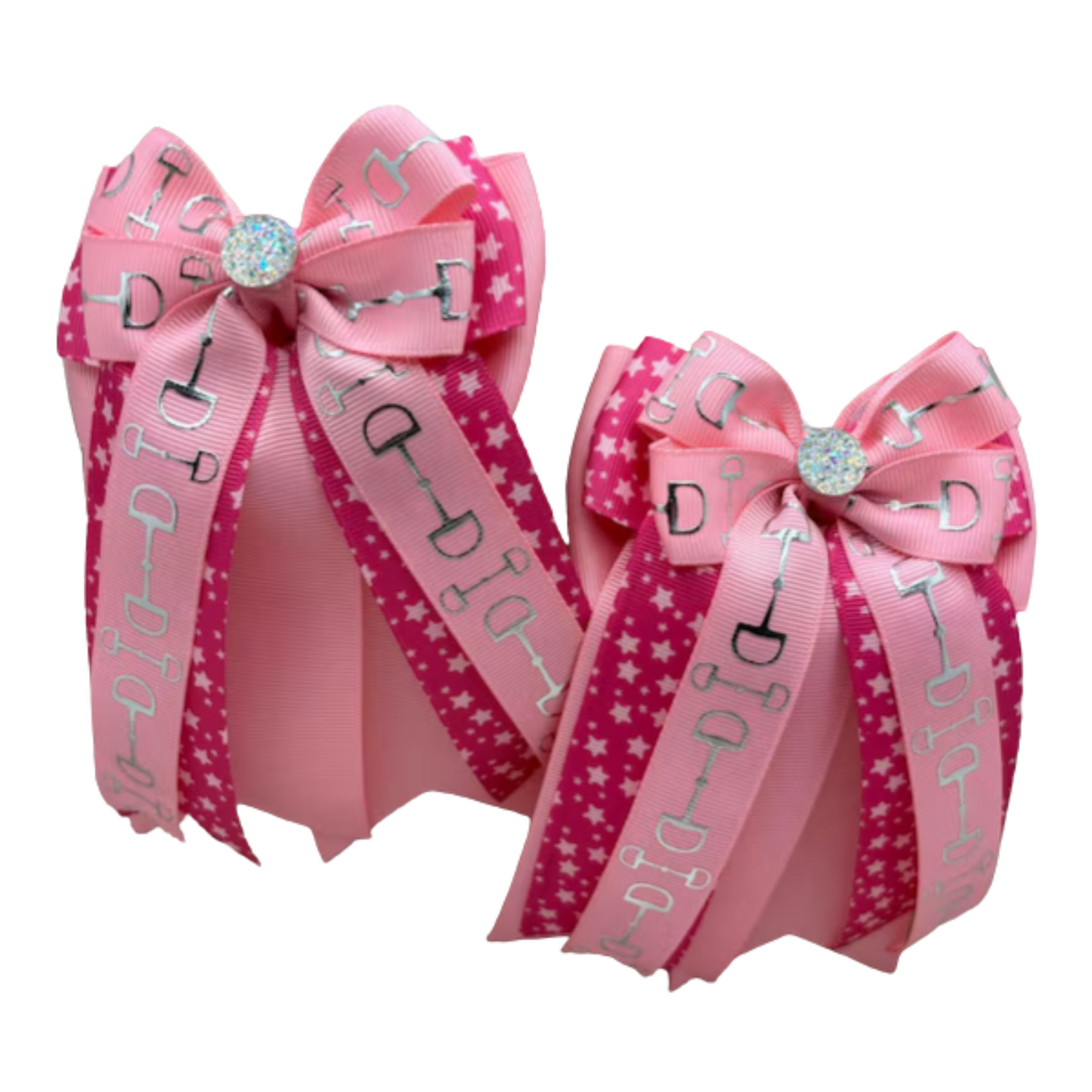 Horse show hair bows for short stirrup divisions, children's ponies divisions, and leadline. Beautiful, one-of-a-kind show bow, sold in a set. finished with a metal alligator clip in the back. Bows are sold in matching pairs. There are two bows to a set. you will need one set of bows for two braids. These bows are handmade. Though I do my best to make each bow in the set the same, there will be differences within the set.