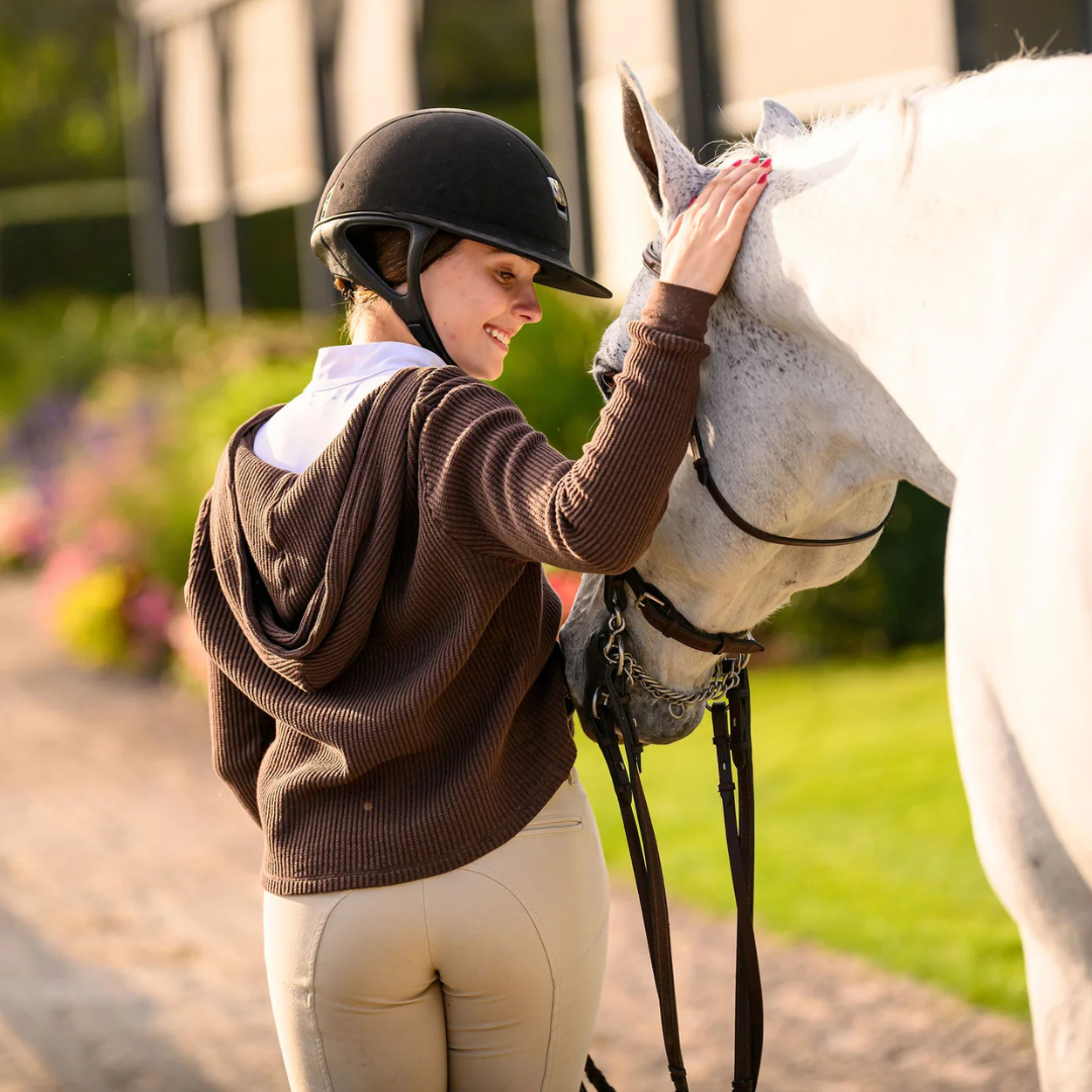 Meet Coco's sister, Cali (your same favorite sweater just with an added hoodie!) Also made from the COZIEST waffle knit fabric. No seriously... we spent *way* too much time perfecting the wash to get this feeling like your favorite worn blanket. Aside from being extra comfy this pullover works double-time getting you from your lesson or show to throughout the rest of your day all while looking pulled together.