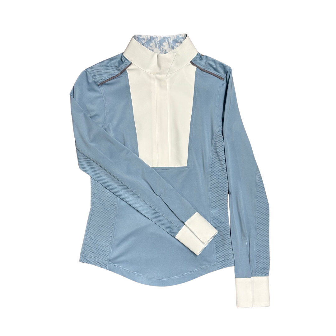 You asked for a SkyCool® Show Shirt and this shirt delivers. Made of the lightest weight fabircs to give you the lightest weight sun shirt ever. Feel the cooling comfort in warm, humid weather conditions by converting sweat into cooling energy so you stay dry and comfortable. SkyCool® fabric is xylitol infused fiber technology for cooling, moisture absorbtion, fast drying, 2-way air circulation and 50+ UV protection. 4-way stretch flat weave fabric offers more stretch and superior comfort. Classic white poplin bib, collar and cuffs lined with unique Liberty® London prints, mesh shoulders, sides and underside sleeve inserts add additional cooling airflow. Pull-over style shirt features a hidden low profile YKK zipper placket and no-show collar and cuff snaps for a polished show look, stock tie loop, shirttail hem and a tailored show fit.