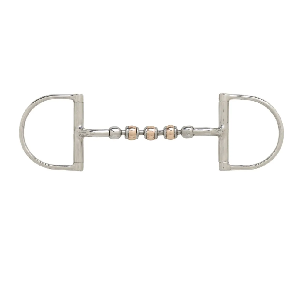 Patented design with a jointed mouth and straight bar mouthpiece, made of stainless steel with copper rollers to occupy a busy tongue and promote salivation.