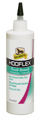 Absorbine Hooflex horse thrush remedy kills and prevents bacteria and fungus that cause thrush and white line disease. Hoof Flex Thrush Remedy helps eliminate associated odors and promotes normal healing. Features squeeze applicator specially designed to reach deep into frog where thrush organisms breed. Does not sting or irritate, does not dry out hoof. Non-staining formula. Contains parachlorometaxylenol and aluminum chlorhydroxy allantoinate.