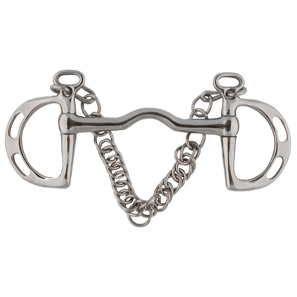 Stainless Steel Bit with slotted D rings, curb chain and a 5" low port Uxeter mouth with thickness of 14mm.