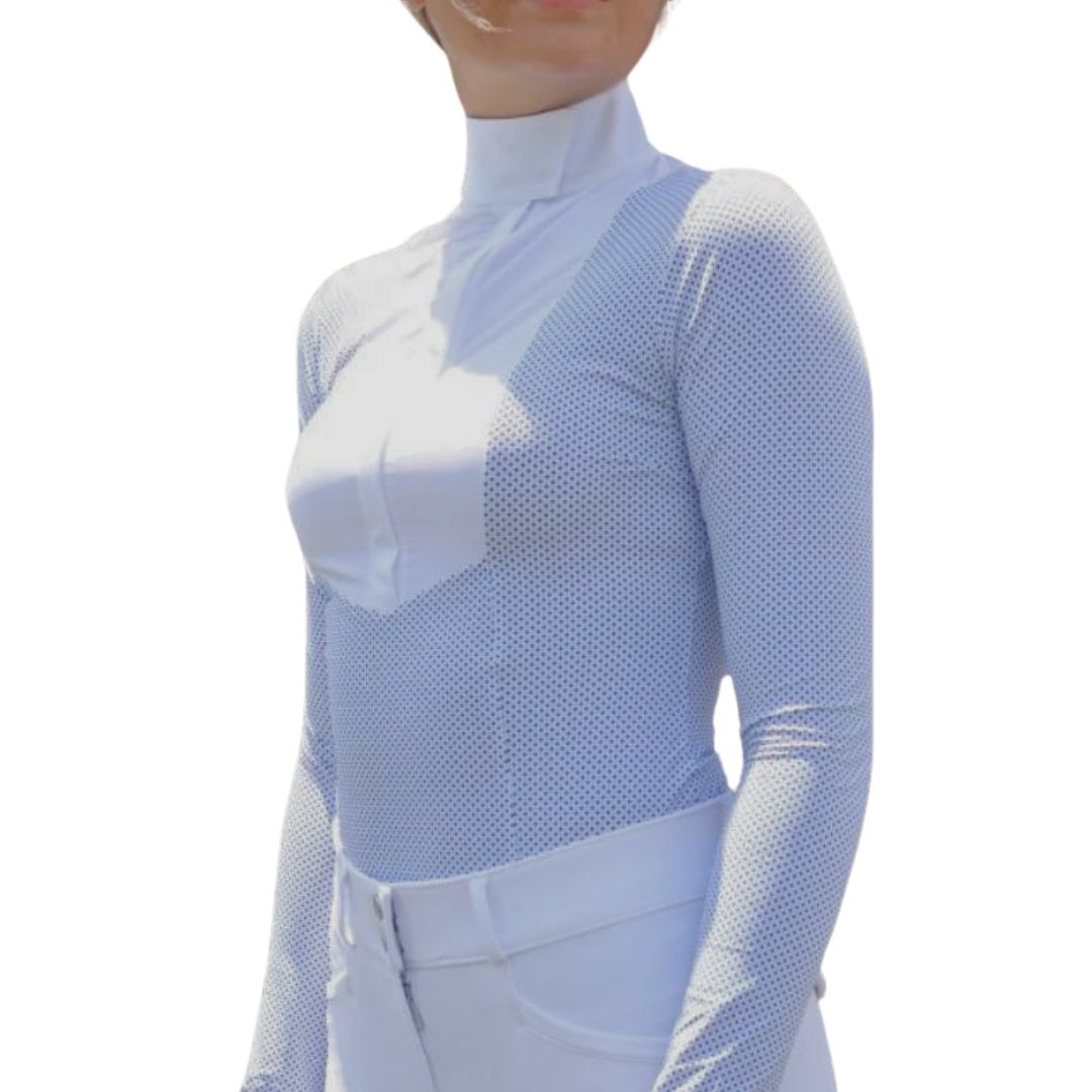 With 1/2″ cuffed sleeves and the white placket bib design, this shirt doubles up as show jacket when used in conjunction with the Airbag Safety Vests. The shirt features an 1/4 length invisible concealed zipper. The crossover collar is just the right firmness making it ideal for competition use.