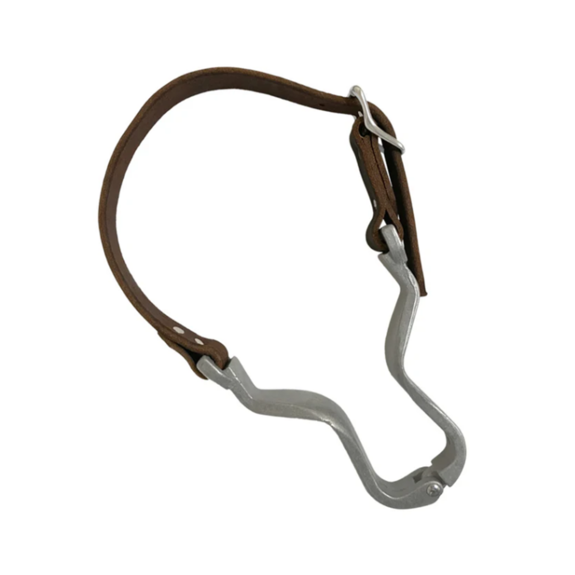 Leather Cribbing Strap is made with a strong, aluminum throat piece hinged to apply the proper pressure on the throat when horse cribs. Adjustable leather neck strap.