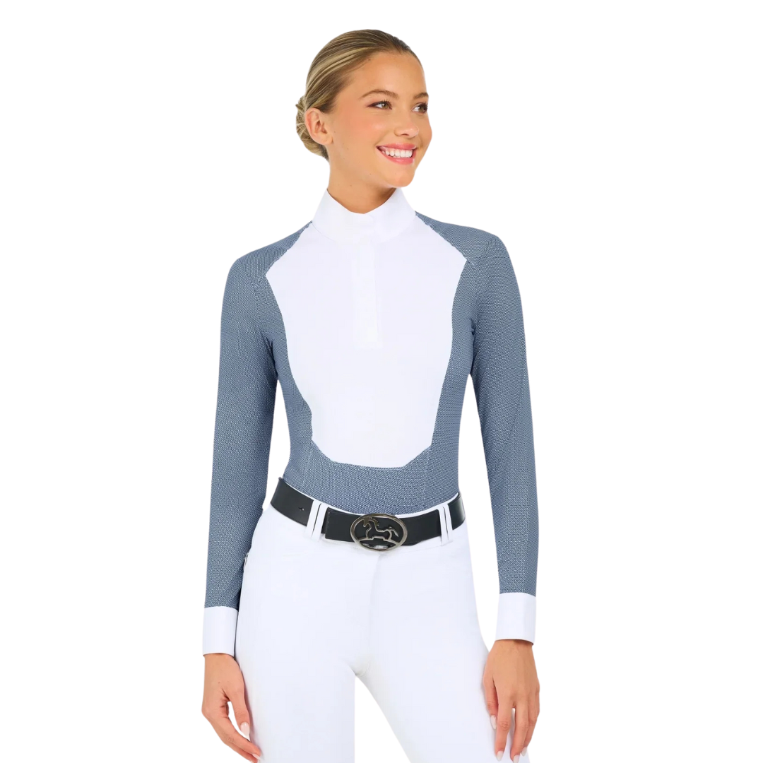 The Liv show shirt is designed to bring additional style and versatility to the show ring. Modern seam lines and silky, cooling fabric ensures that rider’s stay comfortable and confident. The unique prints, paired with a white collar and front bib, elevate its style without compromising the classic look under a show coat.