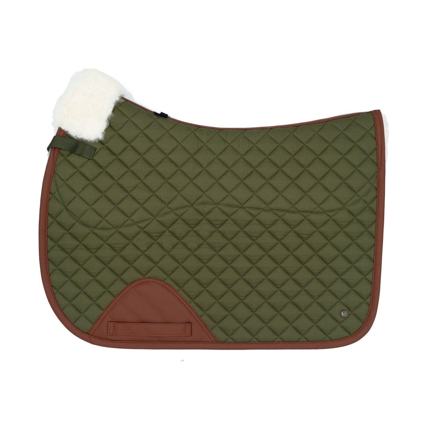 Ideal for clipped coats or sensitive skin & backs, natural Merino Wool quarter lined Jumper Pad in olive green, finished in contrasting cognac leatherette.
