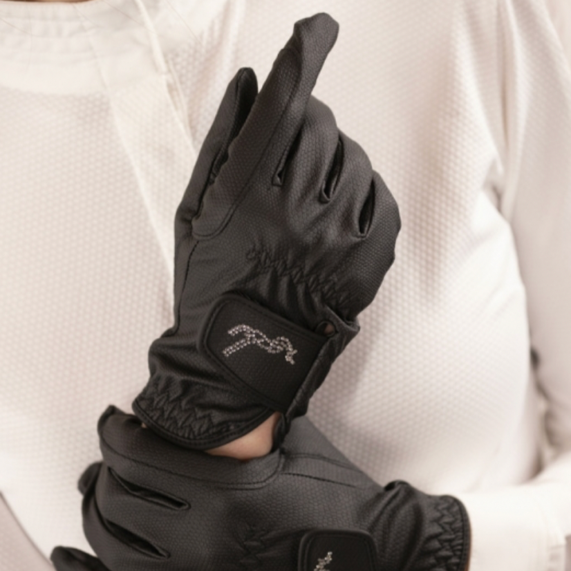 The "Prisma" gloves by Pénélope are chic, girly, comfortable, and feature a reinforced thumb and index finger area for increased durability. The logo in rhinestones on the Velcro adds a touch of style. Suitable for both daily wear and shows.