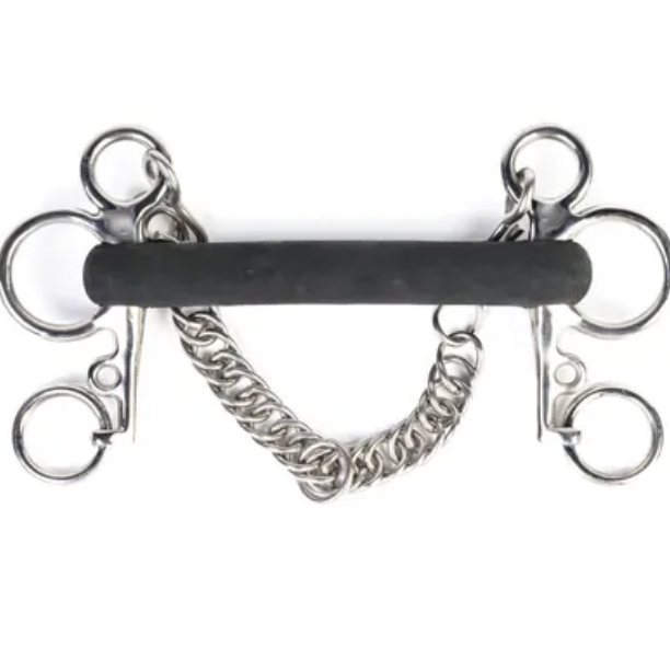 The rubber allows less movement and provides a softer mouthpiece for the horse. Has a shorter more mild shank. Can be used with double reins or bit converter.