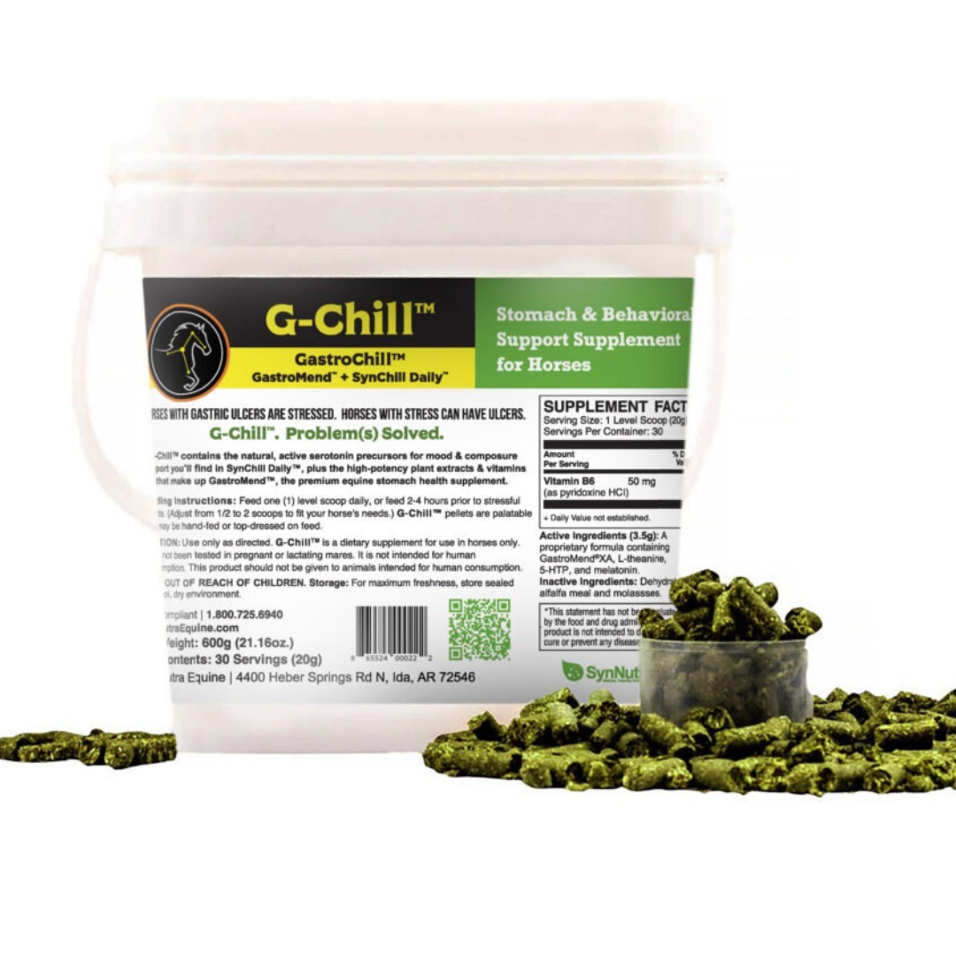 G-Chill™ is a 2-in-1 supplement that helps manage gastric ulcers and reduces stress in horses. It features natural serotonin precursors for mood and composure, and gut-protective plant extracts and vitamins for digestive health. Just one scoop a day is all it takes for a calm stomach and quiet mind.