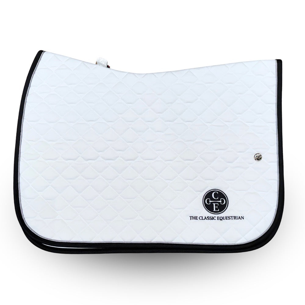 The Classic Equestrian logo embroidered on a white Ogilvy pad with silver piping and black trim