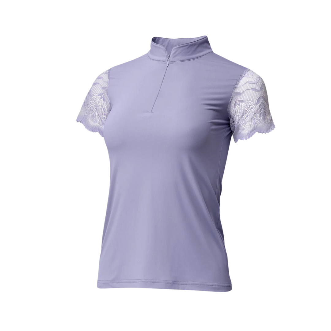 Made in an ultra soft, moisture-wicking tech fabric, the Charlie features a mandarin collar, 3/4 invisible zip, chic lace sleeve detailing and metallic embroidered halter ego logo on the back center of the collar.
